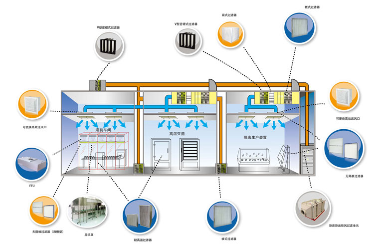 “民以食為天”,當(dāng)今社會(huì),人們對(duì)食品衛(wèi)生越來越關(guān)注。在食品生產(chǎn)領(lǐng)域,嚴(yán)格要求生產(chǎn)設(shè)施必須有效避免任何潛在污染風(fēng)險(xiǎn)。經(jīng)過HEPA空氣過濾器后,食品行業(yè)加工環(huán)境(ISO8級(jí)或ISO9級(jí))對(duì)細(xì)菌和顆粒物的有效控制起到顯著效果。食品灌裝線,如飲料、酸奶、啤酒,更要達(dá)到ISO5級(jí)或ISO6級(jí)要求。在不添加防腐劑的前提下,能保證食品的顏色,味道和其它感官品質(zhì),從而大大延長(zhǎng)食品的保質(zhì)期。